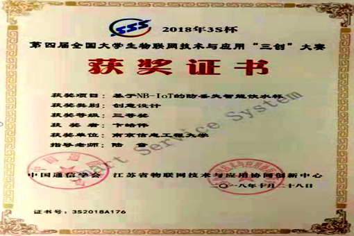 近日,第四届3S杯全国大学生物联网技术与应用“三创”大赛在杭州落下帷幕。计软院2016级计算机科学与技术本科专业1班卞皓伟同学的《基于NB-IoT的防丢失智能饮水杯》从全国1158支参赛队伍中脱颖而出,荣获全国设计创意组三等奖。