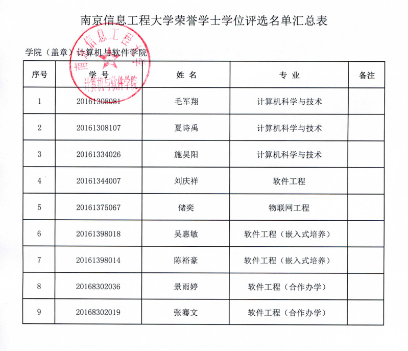 根据《南京信息工程大学荣誉学士学位实施办法(试行)》有关规定,计算机与软件学院开展2020届普通本科生荣誉学士学位评选工作。现将学院评选名单公示如下(排名不分先后):
