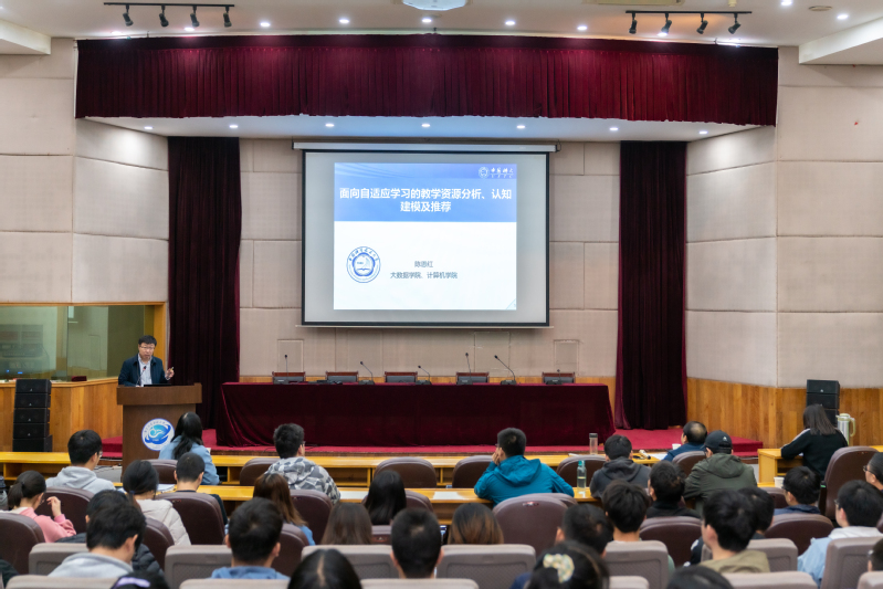 本次报告会的题目为《面向个性化学习的认知建模、教学资源分析及推荐》。在报告中,陈恩红教授指出,个性化学习是教育教学的核心,近年来,在线教育积累下来的学习数据强有力地支撑了以数据驱动的个性化学习研究。然而,现有的计算模型难以从海量、稀疏、高噪的学习数据中准确分析学生的学业水平特点,面临着学习资源表征困难、学习过程建模复杂以及学习策略难量化等挑战。报告以教学过程中涉及的学习资源、学生、学习策略为对象,通过结合数据挖掘技术和教育方面领域知识,介绍面向个性化学习的认知建模、资源分析以及推荐方法与应用。