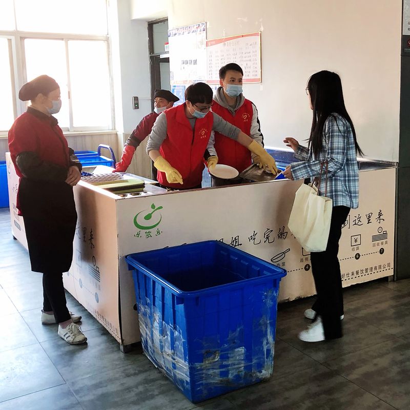 支部同学在餐厅醒目位置张贴宣传条幅,其他成员分散在餐厅入口、用餐区等各处,引导用餐学生共同践行光盘行动。同时,在餐具回收区设置摊位,对主动践行“光盘”行动的同学们赠送温馨小礼物,以激励用餐学生做到“光盘”,杜绝餐饮浪费行为。来食堂就餐的同学们也积极主动参与到本次活动中,纷纷在“厉行勤俭节约,反对铺张浪费”条幅上签字,承诺从自身做起,让“光盘”成为一种习惯。厨余回收劳动体验让同学们切身感受到了身边存在的食物浪费现象,以及食堂工作人员劳动之辛苦。参与志愿服务的入党积极分子杨奇同学说:“在吃饭高峰期,我们两个人手忙脚乱,我们真正体会到食堂阿姨们的劳动辛苦,以后一定主动自觉摆放好餐盘。”姚俊飞同学说:“我们应该积极响应习近平总书记光盘行动的号召,坚持不浪费一粒粮食!一粥一饭当思来之不易,半丝半缕恒念物力维艰。”