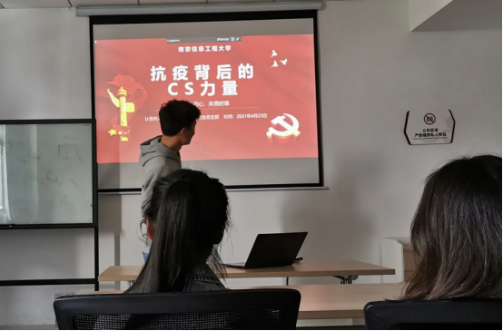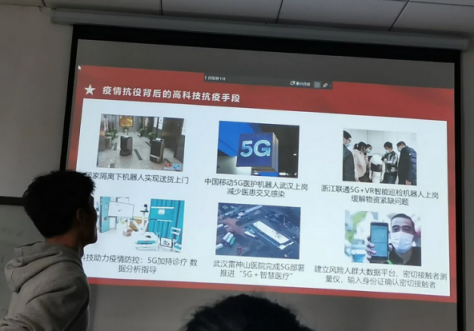 活动前期,支部党员独立进行个性化调研,结合自己的专业方向如:大数据、图像处理、区块链、计算机网络等,寻找相关的抗疫技术,探寻背后的技术性难题和相关进展。活动当天,党员代表祝庆峰进行了PPT汇报演示,他从疫情大数据可视化、AI系统助力疫情防控、高科技医疗防疫手段三个方面进行了细致的分享,并详细介绍了新冠肺炎智能评价系统的内容、智能疫情防控机器人的工作方式和雷神山5G+智慧医疗的部署推进情况。接着,支部同学们在慨叹CS技术强大的同时,也深感自己肩头的责任。最后,同学们集中观看了一段关于中美关系的时政评论视频,感受国际形势的风云变幻和祖国的大国担当,并进行热烈讨论。