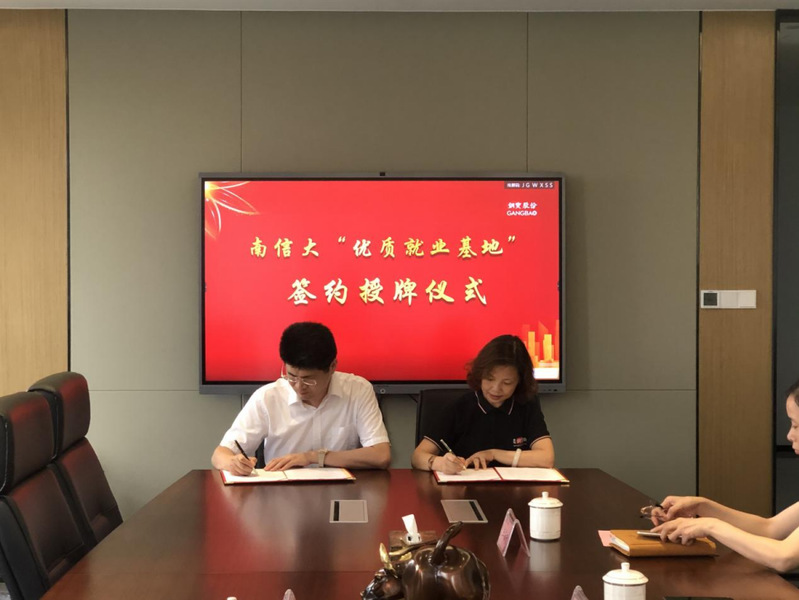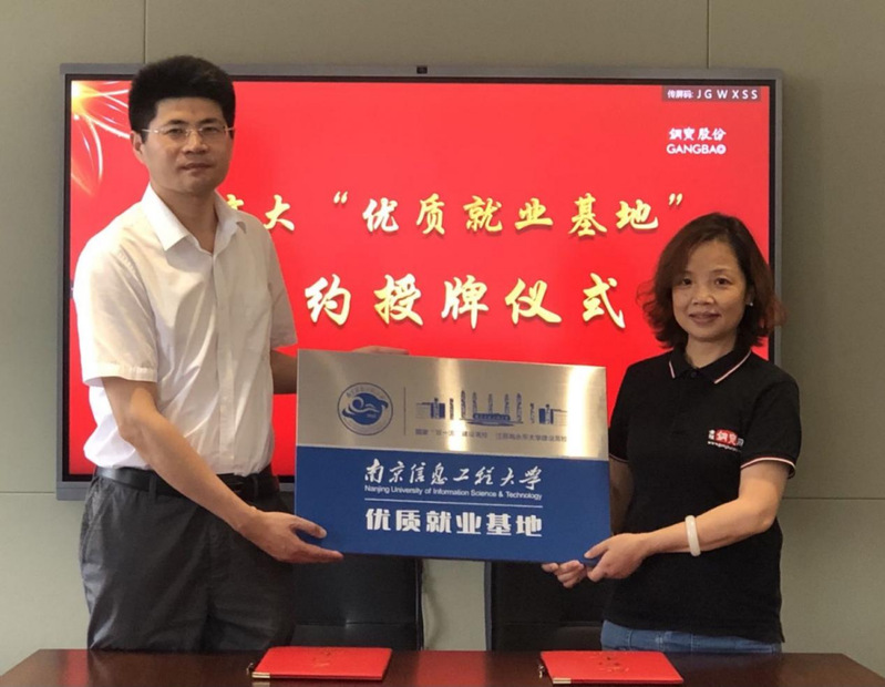 签约授牌仪式上,薛红玉首先对巨传友一行表示热烈欢迎,并介绍了公司经营业绩和数字化发展方面所取得的成果。她指出本次就业基地建设签约和授牌是促进双方校企合作的良好开端,希望后续能在人才培养、技术交流、项目开发等方面持续探索开展全方位合作,不断将高校人才与科研成果向企业生产力转化。随后,巨传友充分肯定了钢宝股份与数一科技在数字化转型方面的前瞻性布局,并介绍了计软院在师资力量、专业设置、人才培养方面的优势和特色。他希望双方以“优质就业基地”签约授牌为契机,充分发挥双方同在江北新区的地缘优势,在软件开发、物联网、智能算法等方面进一步加强双方之间的沟通与合作,提升人才培养的质量同时让教学与科研更好地服务企业和社会,有效促进校企双方的互利互赢。仪式最后,薛红玉与巨传友分别代表双方签署了优质就业基地建设协议书,完成“优质就业基地”授牌,并参观了基地现场。