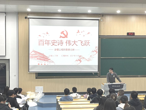 第二位分享的是第三党支部的渠慎迪。他向与会成员详细介绍了《中共中央关于党的百年奋斗重大成就和历史经验的决议》基本框架和主要内容。《决议》是一篇马克思主义的纲领性文献;是新时代中国共产党人牢记初心使命、坚持和发展中国特色社会主义的政治宣言;是以史为鉴、开创未来、实现中华民族伟大复兴的行动指南。新时代新征程,唯有自觉向历史请教、向人民学习,才能不断汲取前行智慧,凝聚奋进力量,始终保持一往无前的奋斗姿态,扛起新担当、做出新作为,不负人民,不负时代、不负理想。