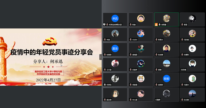 为深入学习体会抗疫精神,筑牢思想根基,研究生第四党支部于4月27日开展了以“青年的力量,未来的希望”为主题的党日活动,旨在分享和讨论疫情中涌现的90后青年党员的感人事迹,在目前严峻紧张的防疫情势下传递积极正能量。会议由支部副书记李恩露主持。