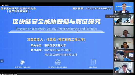 4月25日,由我校主持的国家重点研发计划“区块链”重点专项青年科学家项目“区块链安全威胁感知与取证研究”(2021YFB2700900)项目启动会暨实施方案论证会顺利召开。根据疫情防控要求,会议采用线上形式。