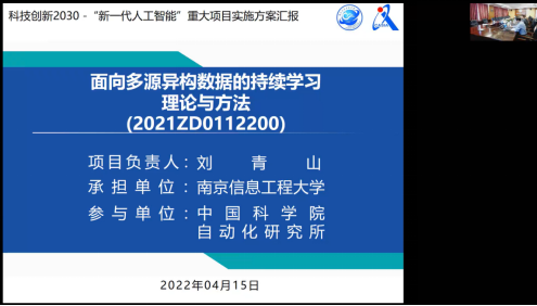 4月15日,科技创新2030—“新一代人工智能”重大项目“面向多源异构数据的持续学习理论与方法”(2021ZD0112200)项目启动暨实施方案论证会在线上召开。项目由南京信息工程大学牵头,负责人为刘青山教授,中国科学院自动化研究所为项目参与单位。