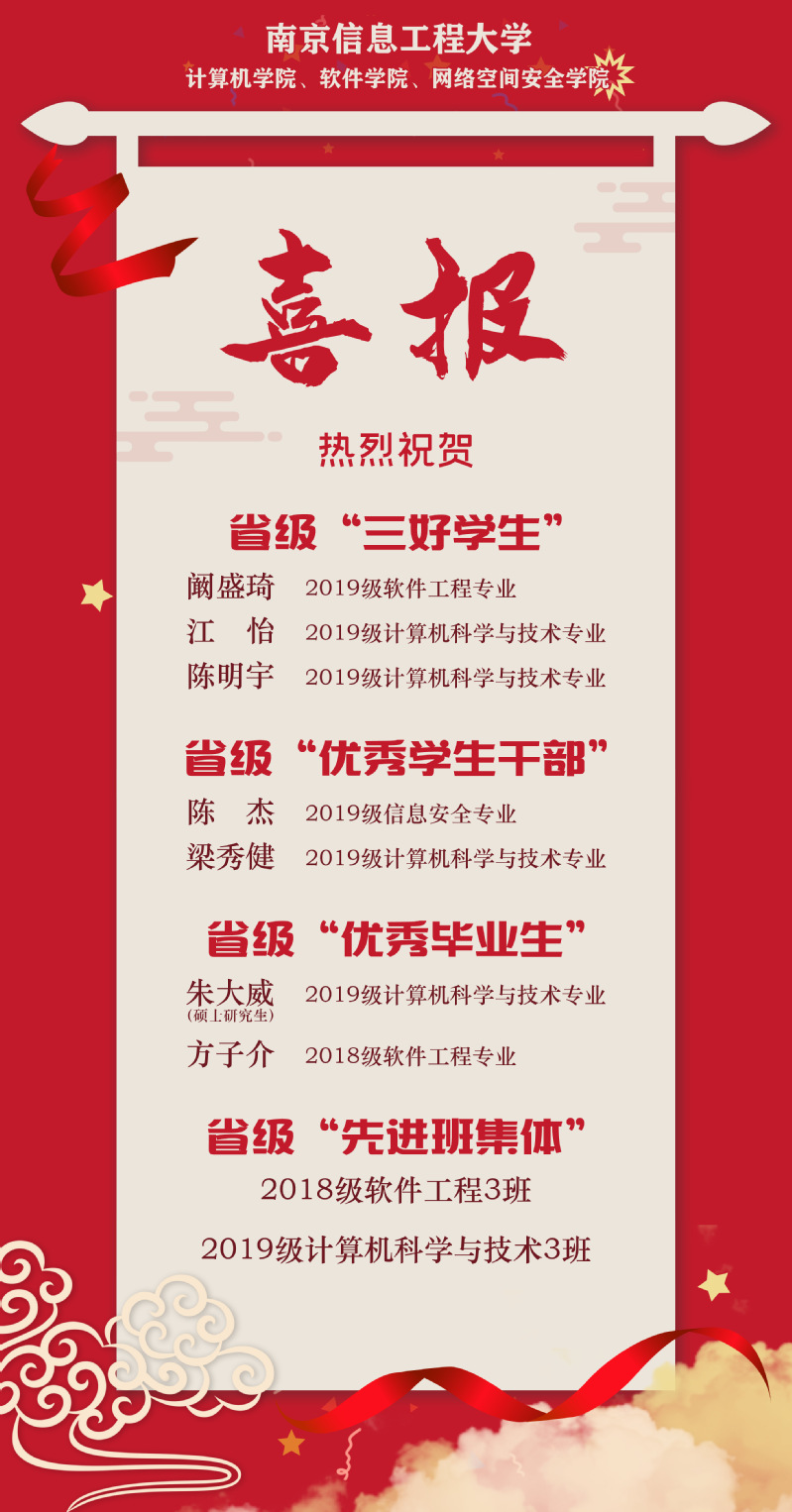 喜报 | 计算机学院7名学生、2个班级获评江苏省三好学生、优秀学生干部、优秀毕业生和先进班集体!