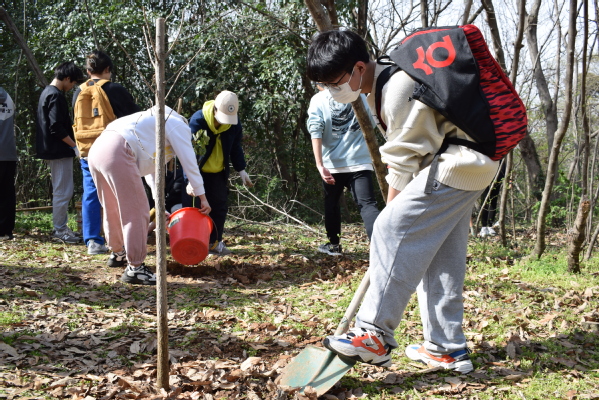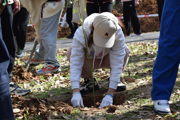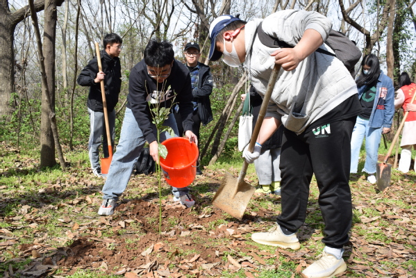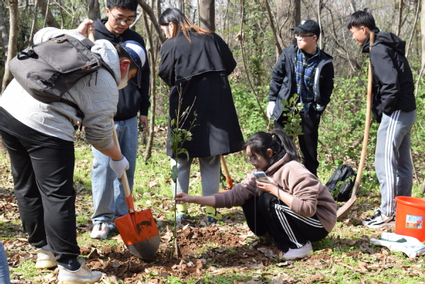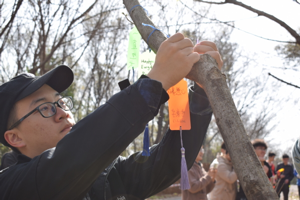 植树现场,志愿者们个个热情高涨,干劲十足,与自己的队员们一起,齐心协力,挥楸挖坑,扶苗填土,相互配合,充分发扬了不怕苦不怕累的雷锋精神,现场一派热火朝天的忙碌景象。植树结束后,大家纷纷将自己的树牌和祈福卡挂在树上,写上自己最好的祝愿,有对自己未来的美好期望,也有对亲人的安康祝福。那写满祈愿语句的彩色卡片和新生的点点青绿在风中摇曳,寄托了大家心中最真挚的情感与期愿。放眼望去,棵棵小树迎风挺立,山黛满目,春生万物,有树可栖,未来可期!活动最后,同学们热情不减,继续开展清洁龙王山志愿行动,努力为龙王山的干净、整洁奉献自己的一份力量。