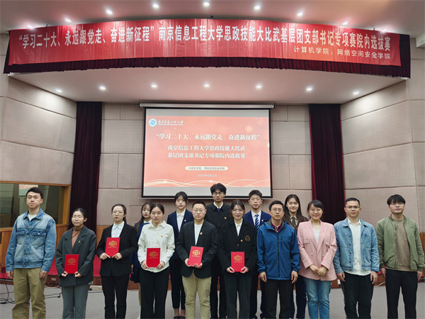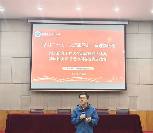 为深入学习宣传贯彻党的二十大精神,进一步聚焦思想引领主责主业,团结引领我院团员青年坚定信念跟党走,勇做走在新时代新征程奋进者,4月22日上午,计算机学院、网络空间安全学院于长望楼报告厅开展了“学习二十大、永远跟党走、奋进新征程”南京信息工程大学思政技能大比武基层团干部书记专项赛院内选拔赛。学院党委副书记、副院长朱文镇,辅导员张乐涵、陆永康、李家、刘杰担任评委。