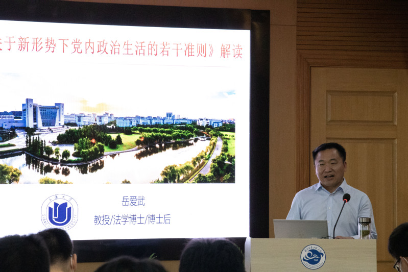 岁月无声,党章为证。党章是党的总章程,是党的根本大法,是全党必须遵循的总规矩。首先,岳爱武教授向同学们介绍了中国共产党章程的发展历史,他强调,党章确立党的最高理想和最终目标是实现共产主义,新形势下加强和规范党内政治生活,必须以党章为根本遵循,党员只有在严格的党内生活中反复锤炼,才能加强党性,百炼成钢。岳爱武分别从坚定理想信念、坚持党的基本路线、坚决维护党中央权威、严明党的政治纪律、保持党同人民群众的血肉联系、坚持民主集中制原则、发扬党内民主和保障党员权利、坚持正确选人用人导向、严格党的组织生活制度、开展批评和自我批评、加强对权力运行的制约和监督、保持清正廉洁的政治本色等方面向同学们讲解了新形势下加强和规范党内政治生活的具体要求,详细阐述其重点所在。