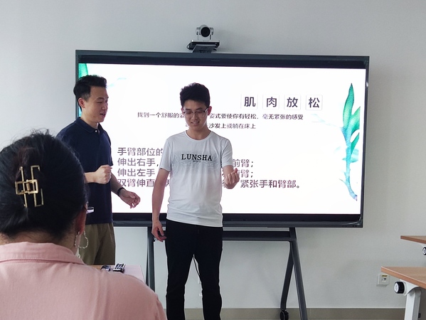 研究生同学在日常学习和生活中往往需要面对学业、科研、求职等多方面的压力,不少同学经常出现烦躁、焦虑、抑郁、紧张等负面情绪,适当的放松训练,有助于同学们缓解压力,消除负面情绪。活动伊始,陆永康为同学们讲授了“放松训练”的原理和常用方法。他向大家介绍, 放松训练是帮助人们从紧张状态松弛下来的一种练习过程。当压力事件出现时,紧张不断积累,压力体验逐渐增强,此时,持续几分钟的放松训练可能比几小时的睡眠效果更好,放松训练主要有呼吸放松法、肌肉放松法、想象放松法等。随后,陆永康邀请同学上台,指导示范了呼吸放松和肌肉放松的方法,带领同学们共同进行放松训练,帮助大家缓解压力,应对不良情绪。