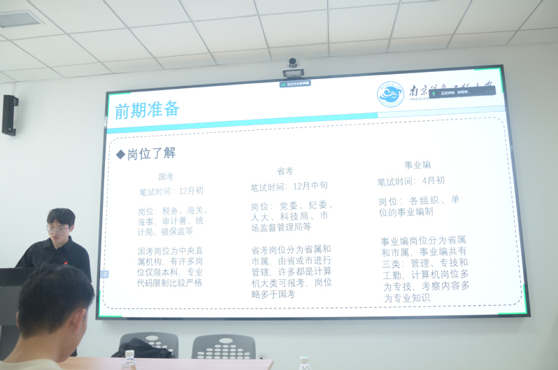 王超智同学分享了自己的报考公务员和事业单位时的备考过程和面试经验。他为同学们梳理了公务员和事业编考试的岗位和报考时间,向同学们介绍了公务员和事业编制岗位的优缺点。他提醒同学们要做好思想准备,不要为了“上岸”而“上岸”,鼓励同学们抓住应届的机会,踏实复习、保持好的心态并勇于尝试。