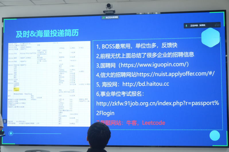 曾磊同学分享了自己的求职历程和面试技巧,他以自己为例,向同学们介绍了确定就业方向、制作并投递简历以及面试的诸多技巧。针对国企和私企的不同特点,曾磊建议同学们能在求职的软硬能力上都做好准备,保持良好的心态去找到自己心仪的工作。