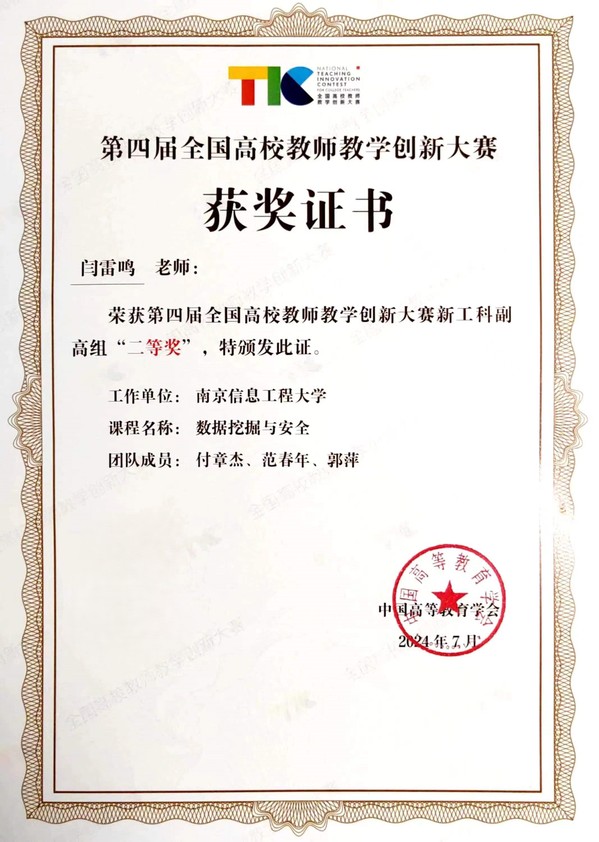 7月31日,由教育部指导、中国高等教育学会主办的第四届全国高校教师教学创新大赛总决赛在成都电子科技大学落下帷幕,本次比赛吸引了全国1249所高校共10万余名教师(团队)参赛,我院教师闫雷鸣代表《数据挖掘与安全》课程教学团队喜获新工科副高组二等奖!