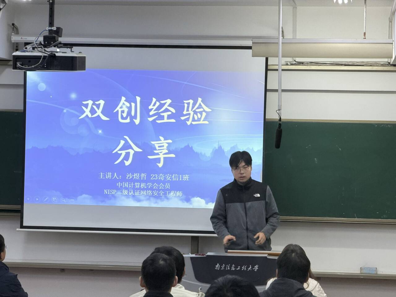 大会邀请学院2023级奇安信1班的沙煜哲同学担任主讲嘉宾,分享双创经验。沙煜哲同学在本科期间成果斐然,已斩获中国国际大学生创新大赛(2025)全国总决赛金奖,积累了极为丰富的大创项目实践与科研创新经验,现为中国计算机学会会员、NISP二级认证网络安全工程师。在分享中,他并未直接展示成功的光环,而是从最初的探索与迷茫讲起,分享了自身在面对众多技术方向时的困惑与选择难题,讲述了自己曾经遇到的挑战。从理论到实践、从竞赛到科研的成长经历,引发了在场同学的强烈共鸣。沙煜哲表示,探索的迷茫或转型的阵痛都是提升的必经阶段,是每一位创新者必须跨越的关卡。最后,他鼓励同学们拒绝照搬、正视挫折,并真诚地欢迎新生力量加入探索的团队。