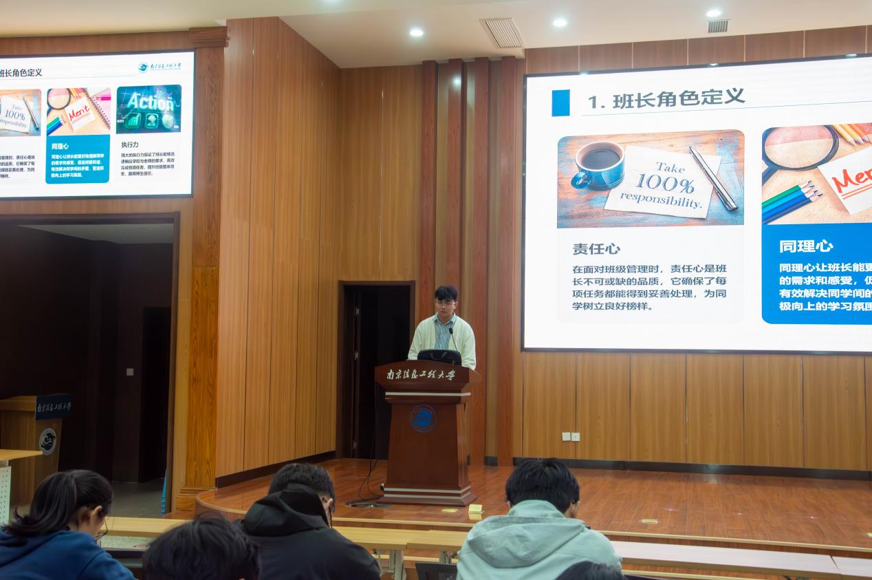 在班级建设环节,计算机技术专硕1班班长李嘉鑫同学结合自身工作实践,分享了班长工作的心得体会与方式方法。他从信息传达、活动组织、同学关怀、班级凝聚力建设等多个角度,介绍了高效开展班级工作的经验。