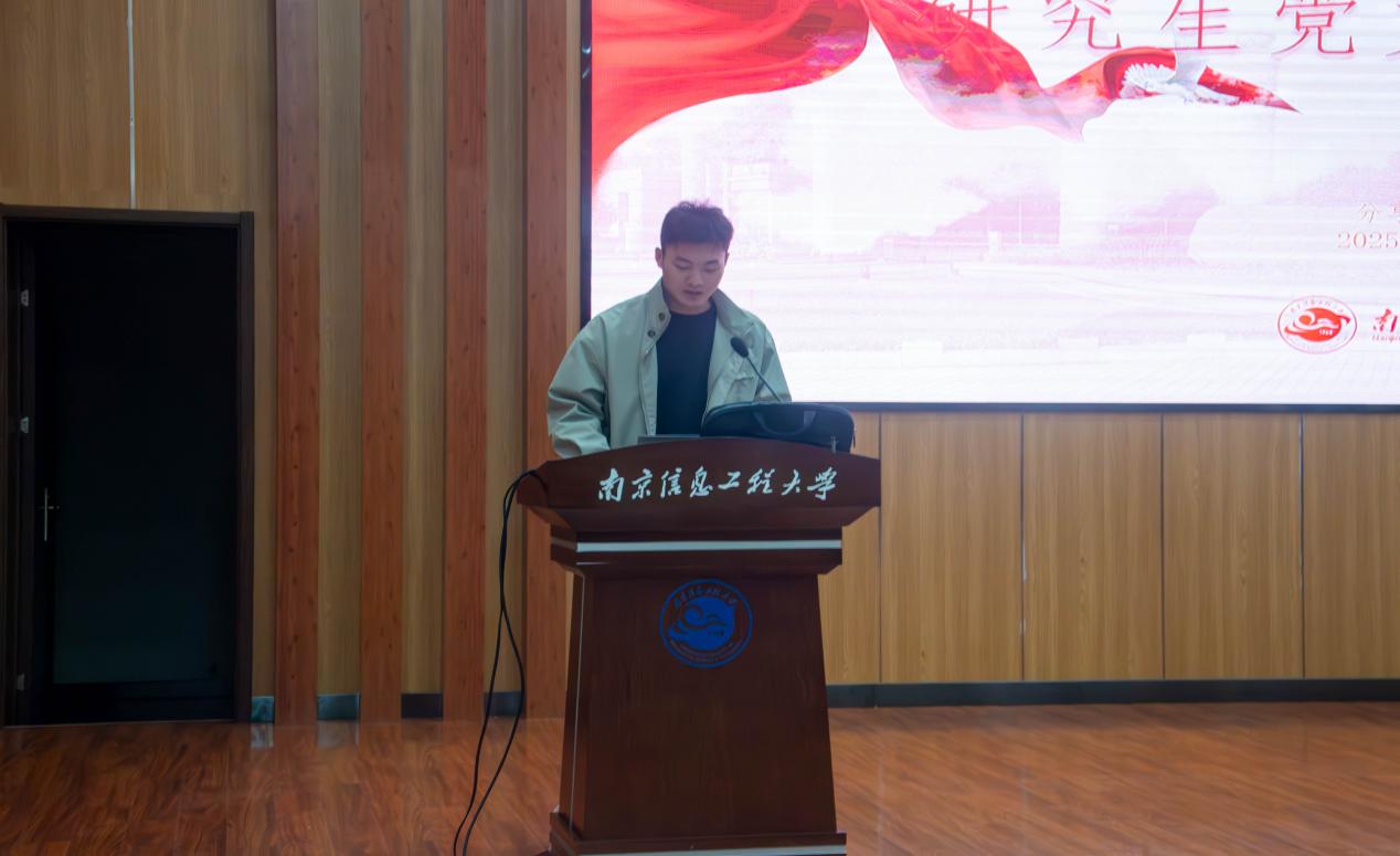 随后,学院研究生第九党支部书记明松同学上台,就党支部的基本情况、入党流程、近期工作重点及未来活动规划向全体同学进行了分享。他介绍了党支部在组织建设、理论学习、服务同学等方面所发挥的战斗堡垒作用,鼓励有志于向党组织靠拢的同学积极提交入党申请书,主动参与党支部组织的各项活动,不断提升思想政治觉悟,在集体中锻炼成长。