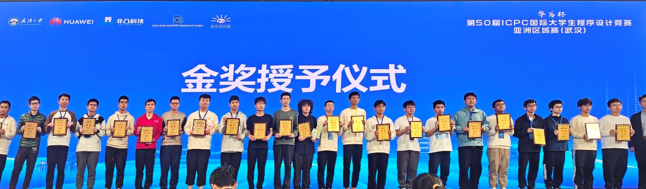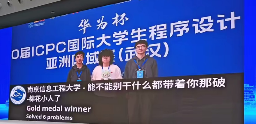 第50届国际大学生程序设计竞赛亚洲区域赛(武汉)于2025年11月1日到2日在武汉大学举行。由我校计算机学院、网络空间安全学院吴军老师带队,计算机学院、网络空间安全学院崔嘉豪、刘一鸣及软件学院龚敏三位同学组成的参赛团队,历经五小时的奋战,最终勇夺金牌,成为首支代表南京信息工程大学在国际大学生程序设计竞赛亚洲区域赛中获得金牌的队伍。