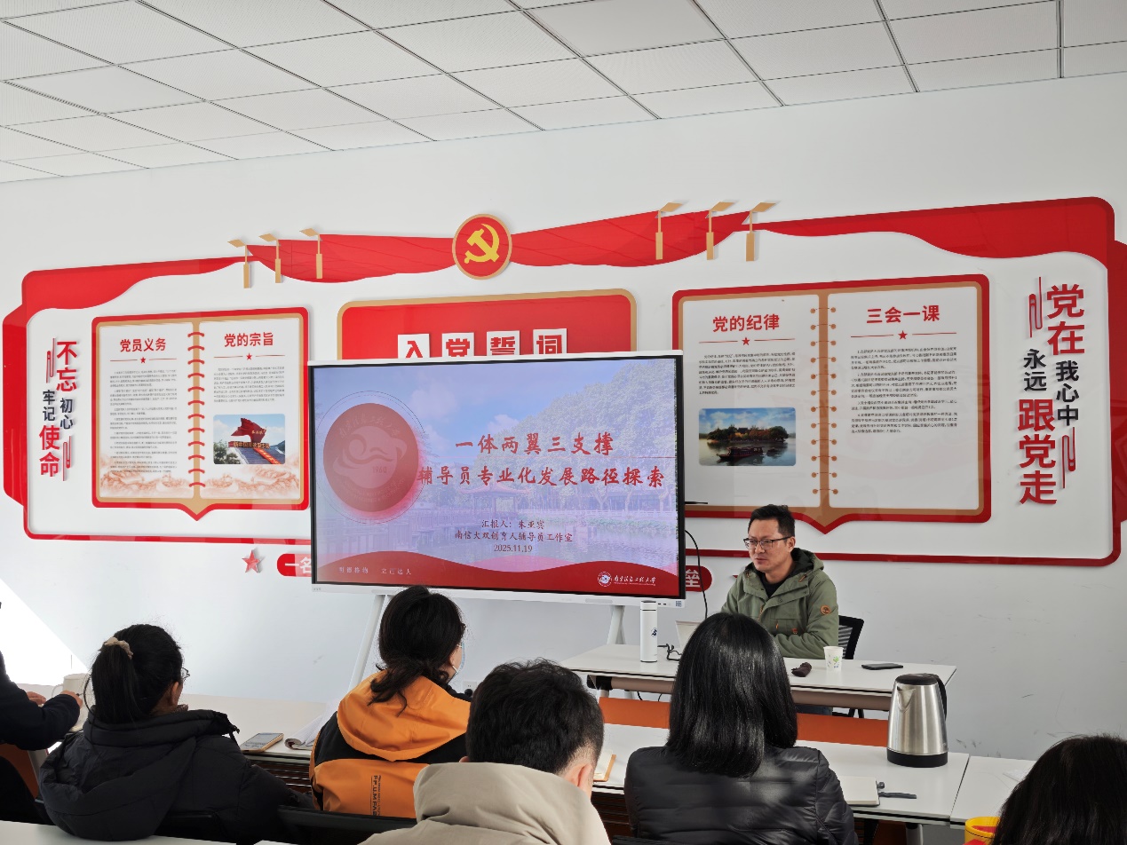 11月19日上午,计算机学院、网络空间安全学院在西苑社区红色驿站举办辅导员专题培训。本次培训聚焦新时代辅导员在创新创业工作板块的实践与发展,特邀遥感与测绘工程学院学办主任朱亚宾副教授担任主讲嘉宾,作题为“一体两翼三支撑——辅导员专业化发展路径探索”的专题报告。培训由计算机学院、网络空间安全学院党委副书记、副院长朱文镇主持,学院全体辅导员参加。