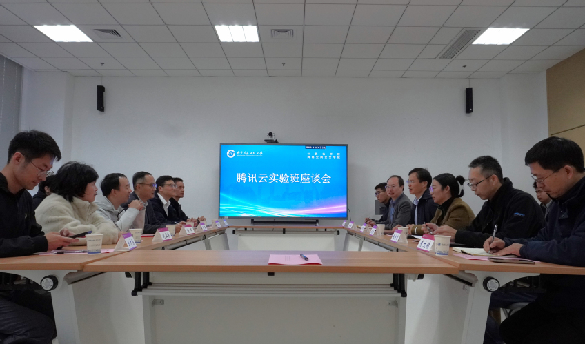 11月25日上午,南京信息工程大学计算机学院、网络空间安全学院在临江楼A104举行腾讯云实验班建设座谈会。腾讯云副总裁、腾讯教育解决方案负责人杨晖、腾讯教育基高教总经理饶臻、腾讯教育架构师总监刘亚林、腾讯教育江浙皖负责人徐晓瑀、腾讯教育专家架构师王才荣、腾讯教育架构师何泽恩等企业代表,校教务处副处长汪佳玲,计算机学院、网络空间安全学院院长付章杰、党委书记张京波、党委副书记兼副院长朱文镇、副院长田伟,以及2022-2025级腾讯云实验班学生代表共同参会。会议由张京波主持。