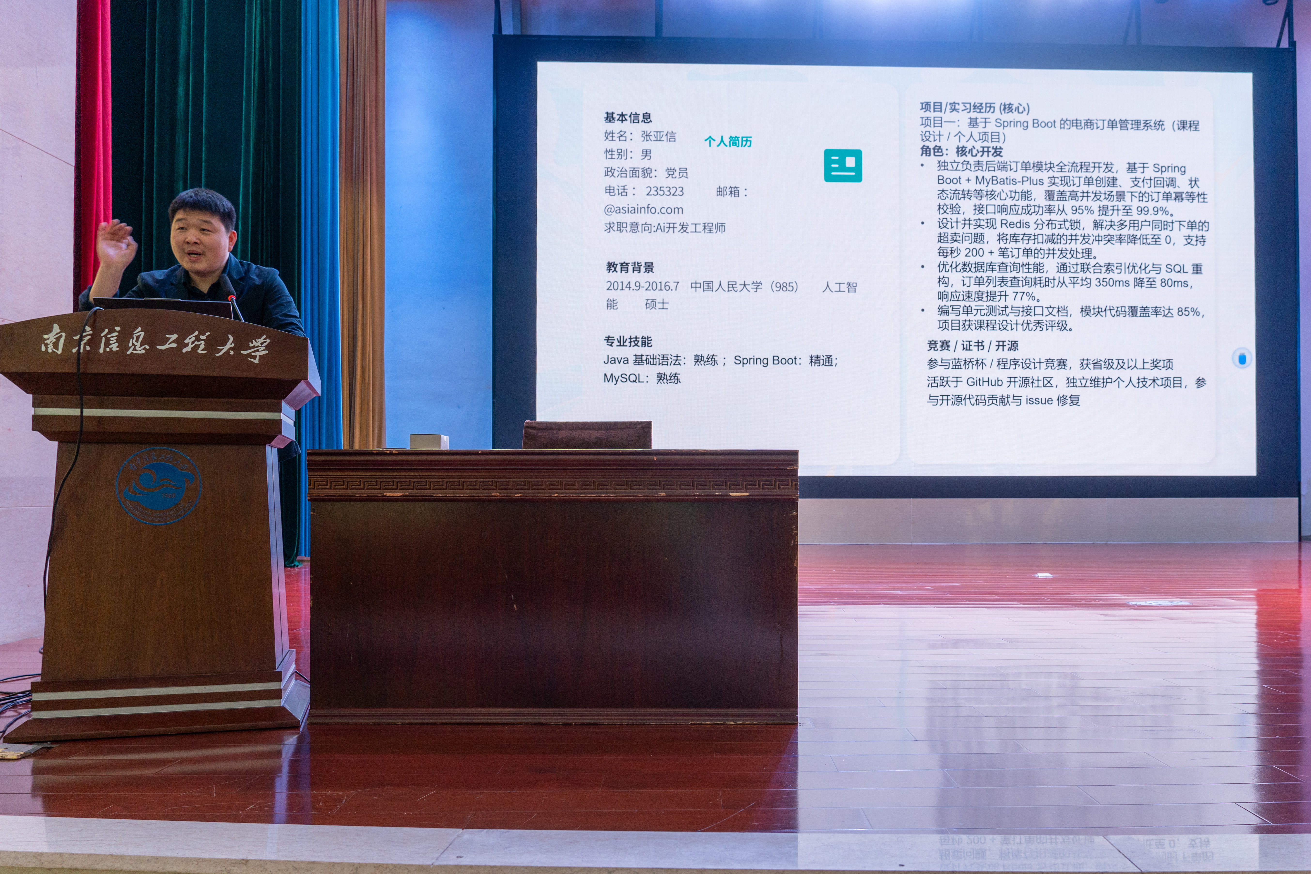 讲座中,亚信科技两位嘉宾首先结合亚信科技业务布局、人才培养体系以及当前IT行业的发展趋势,详细拆解了计算机类相关岗位的职责差异和核心能力要求,让同学们对职场岗位有了更清晰的认知。接着,他们聚焦求职全流程,重点讲解了简历优化、网申笔试技巧、HR面试应答逻辑与技术面试核心考点等,并结合多年招聘经验,分享了诸多实用技巧,还结合AI技术发展趋势为同学们提供了有针对性的能力提升建议,助力大家精准对接企业需求。两位经理的分享从企业视角解读行业需求,用实战经验拆解求职全流程,帮助同学们破解了IT名企求职的关键难题,也为同学们今后在破除开发岗定式,理性选择岗位、重视实习积累等方面指明了方向。